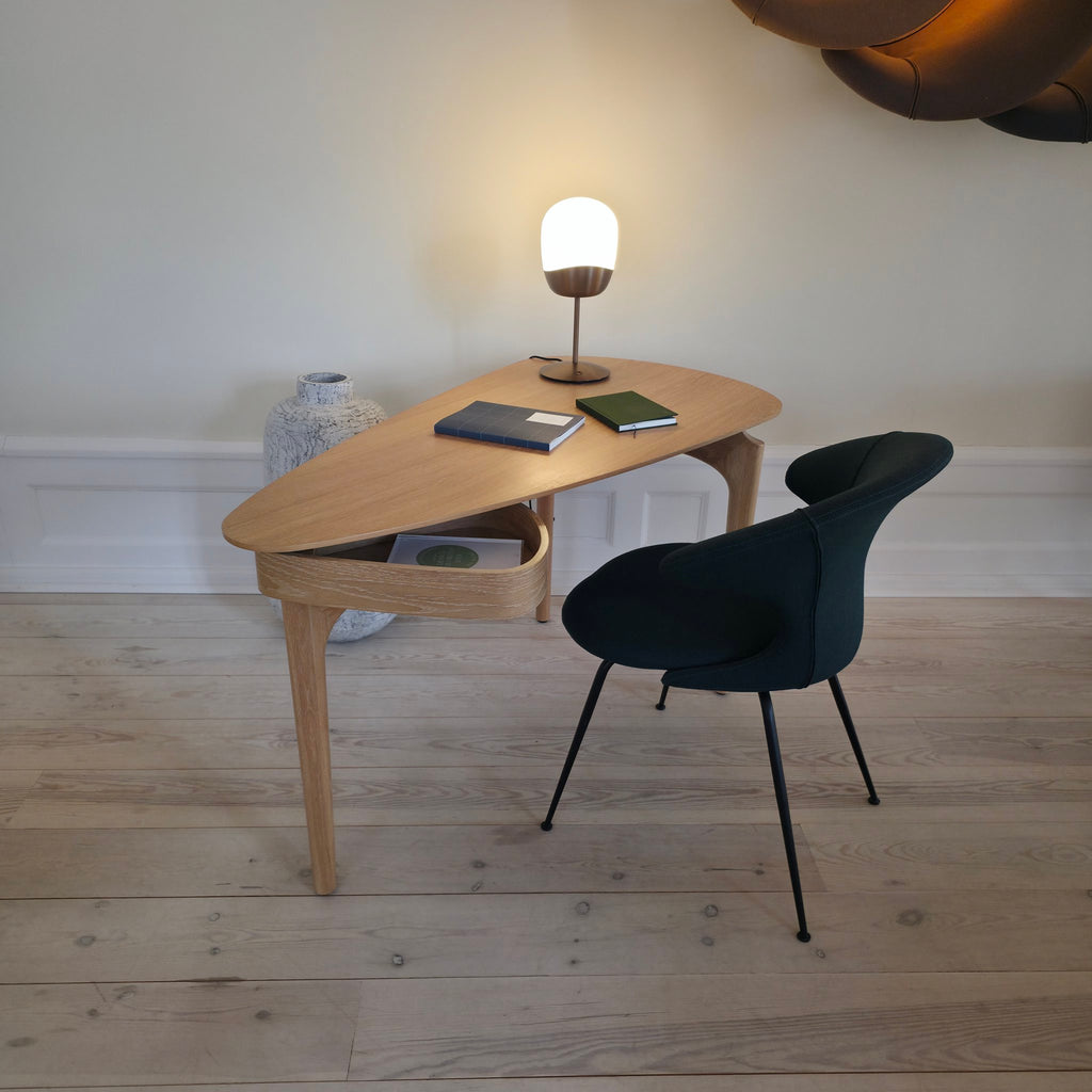 Spring Table ist eine haptische, skulpturale Tischleuchte, die für ruhige, atmosphärische Beleuchtung entworfen wurde. Aus mundgeblasenem Opalglas gefertigt und mit einem markanten, asymmetrischen Messingsockel versehen,...