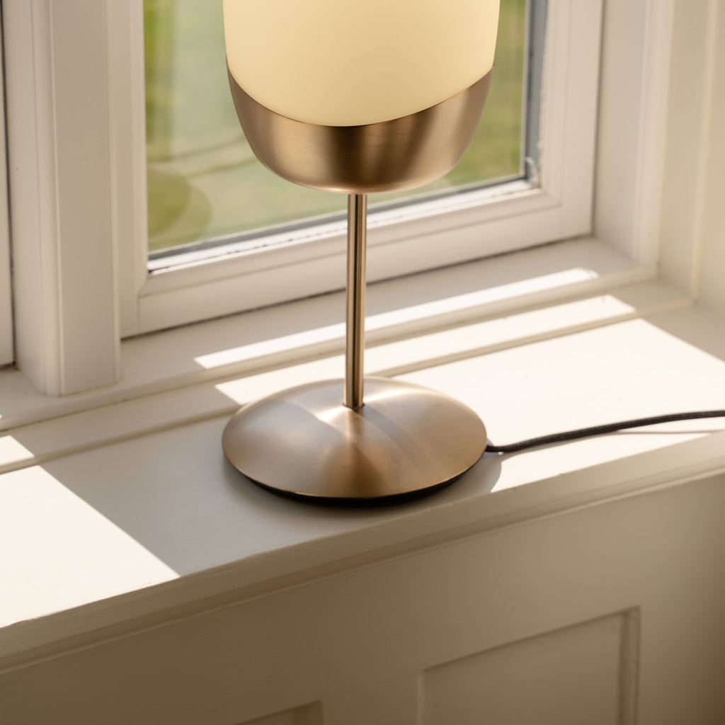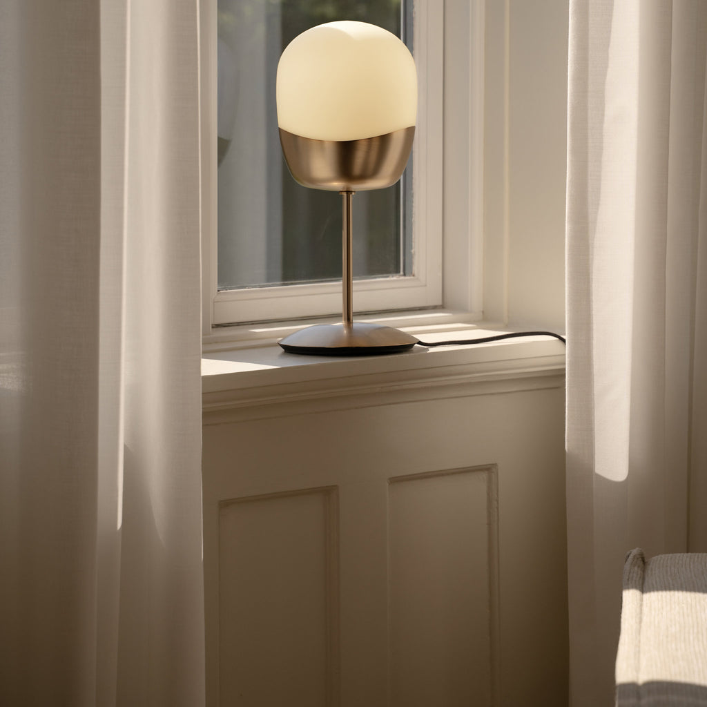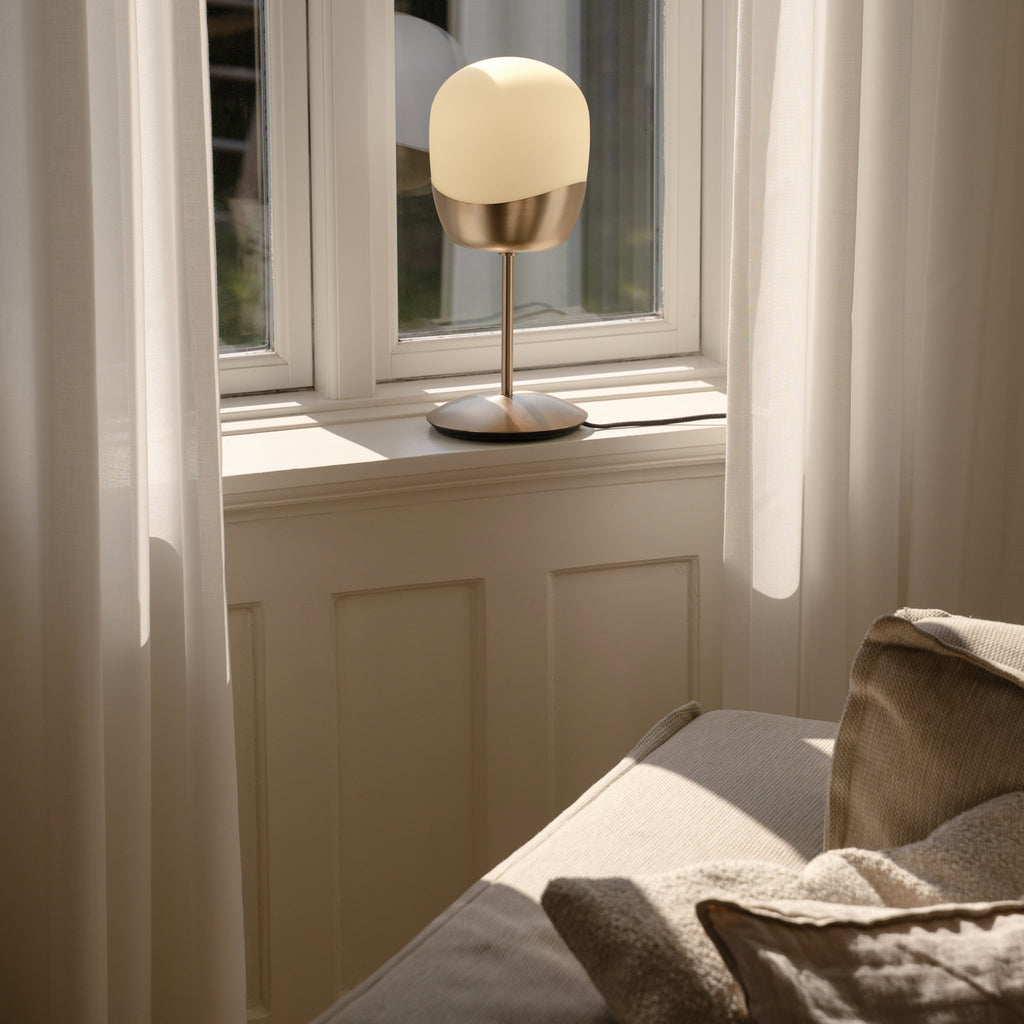 "Soft, milky glass and warm brass meet in subtly asymmetrical forms, evoking the lightness and renewal of spring."