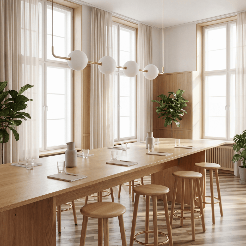 Every part of the construction has been considered to keep the design both durable and visually cohesive. The brass stems connect the glass globes with precision, while the slim canopy and discreet suspension system reduce visual noise and highlight the glowing glass. The use of high-quality brass not only gives the fixture a refined appearance but also ensures long-lasting stability.