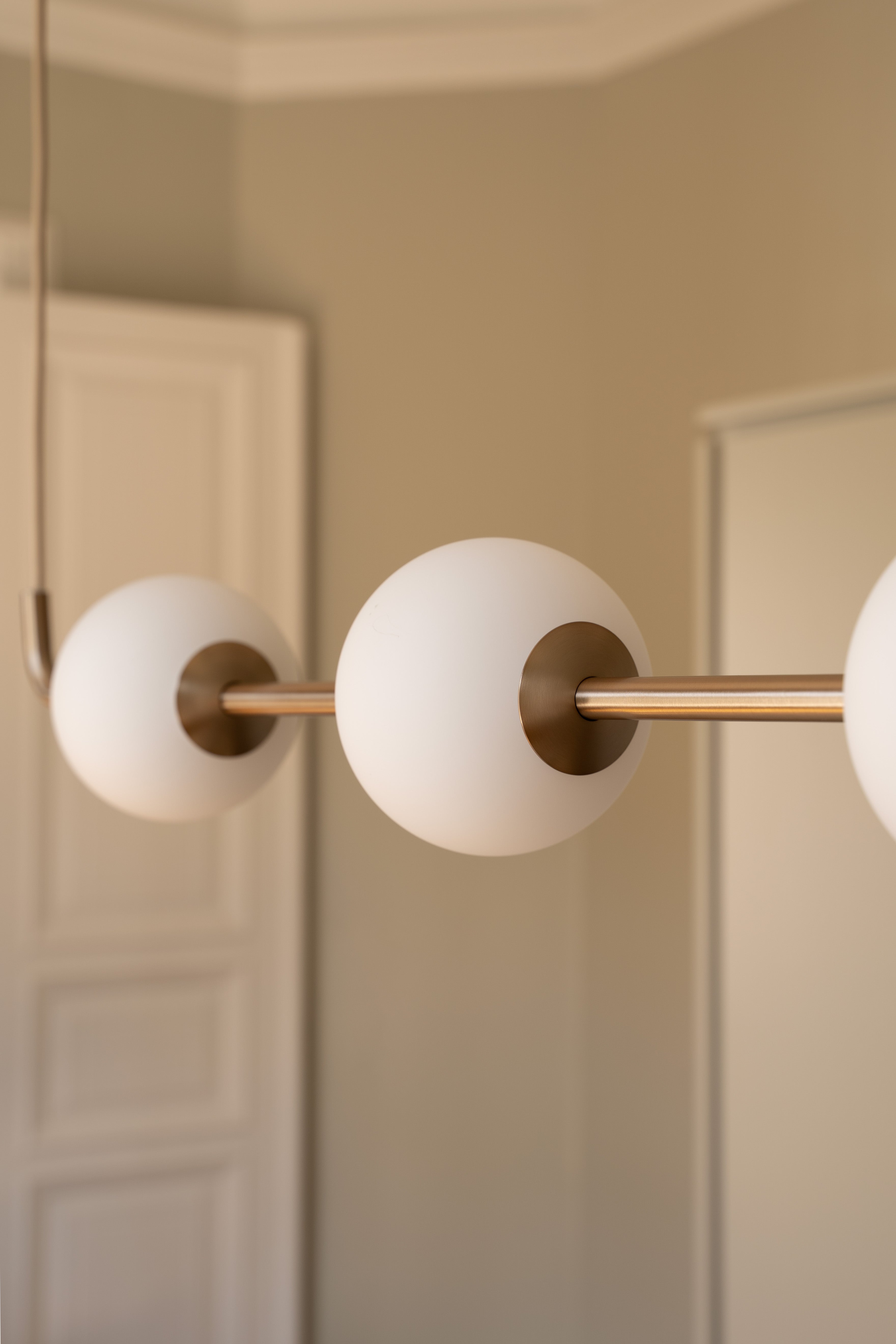 Audrey Linear extends the elegance of the Audrey collection in a new horizontal format. Four opal glass globes, suspended on slender brass stems, create a soft, balanced glow that enhances dining areas, kitchen islands, or workspaces. With its graceful silhouette and timeless blend of brass and mouthblown glass, Audrey Linear brings refined sophistication and warmth to any interior.