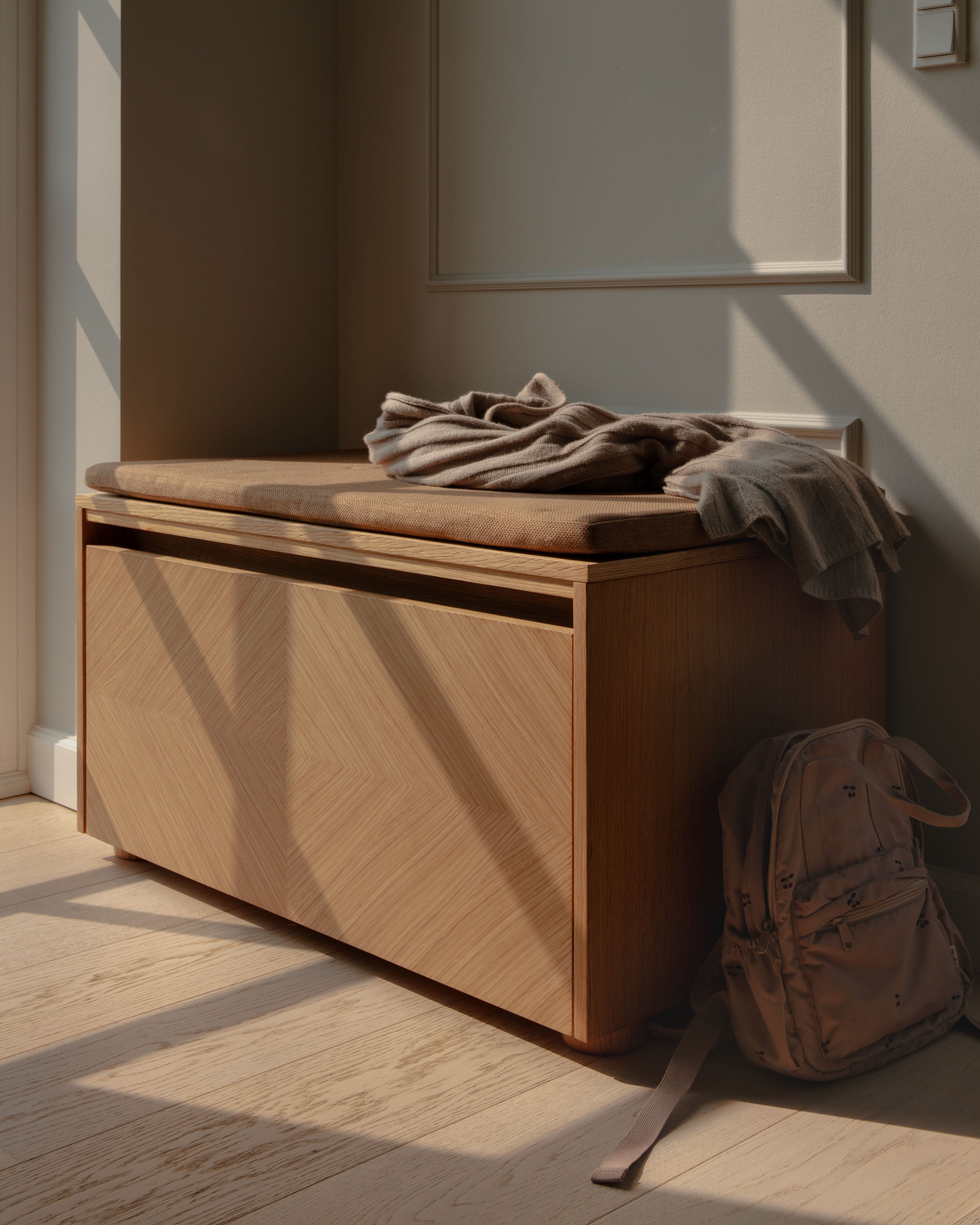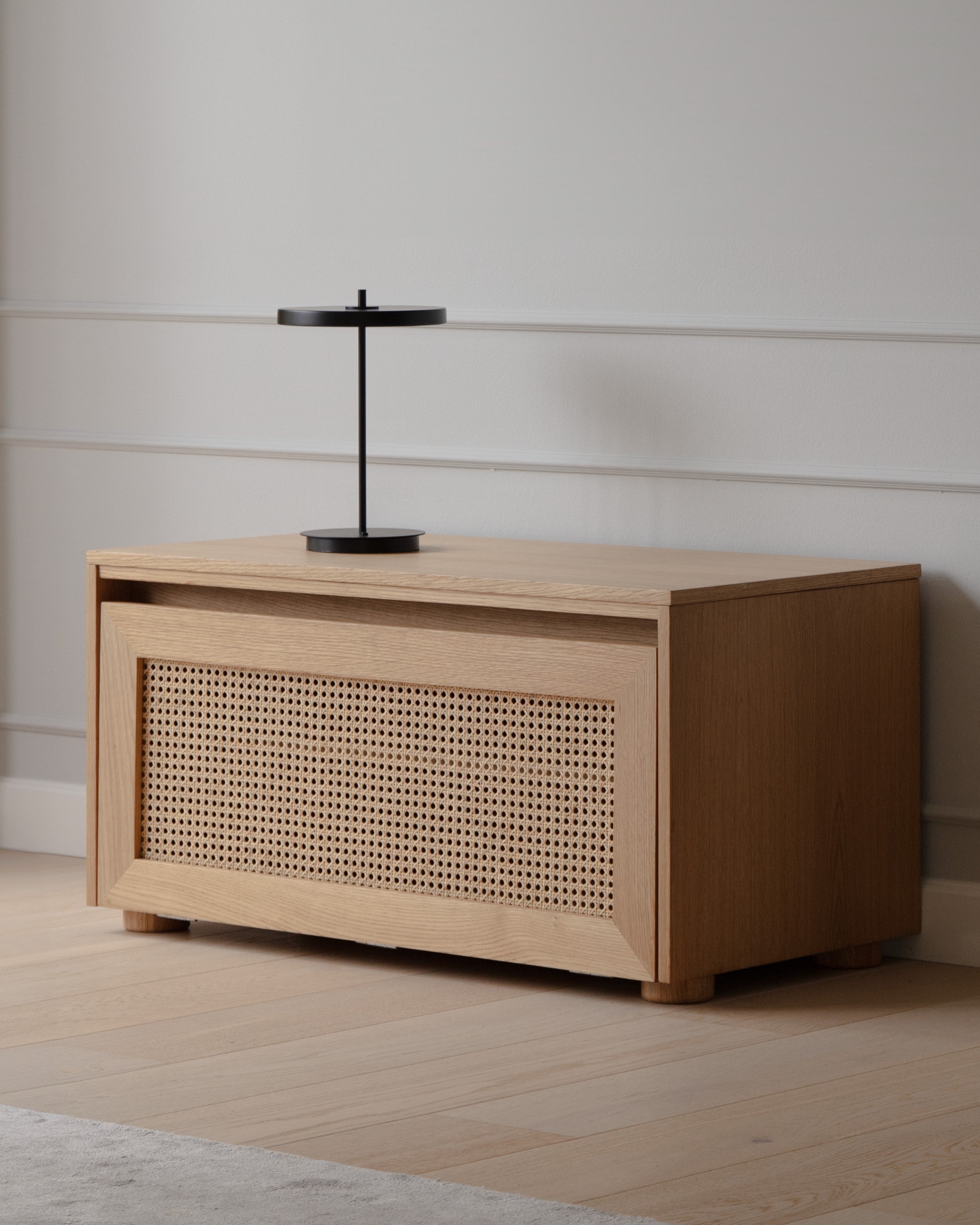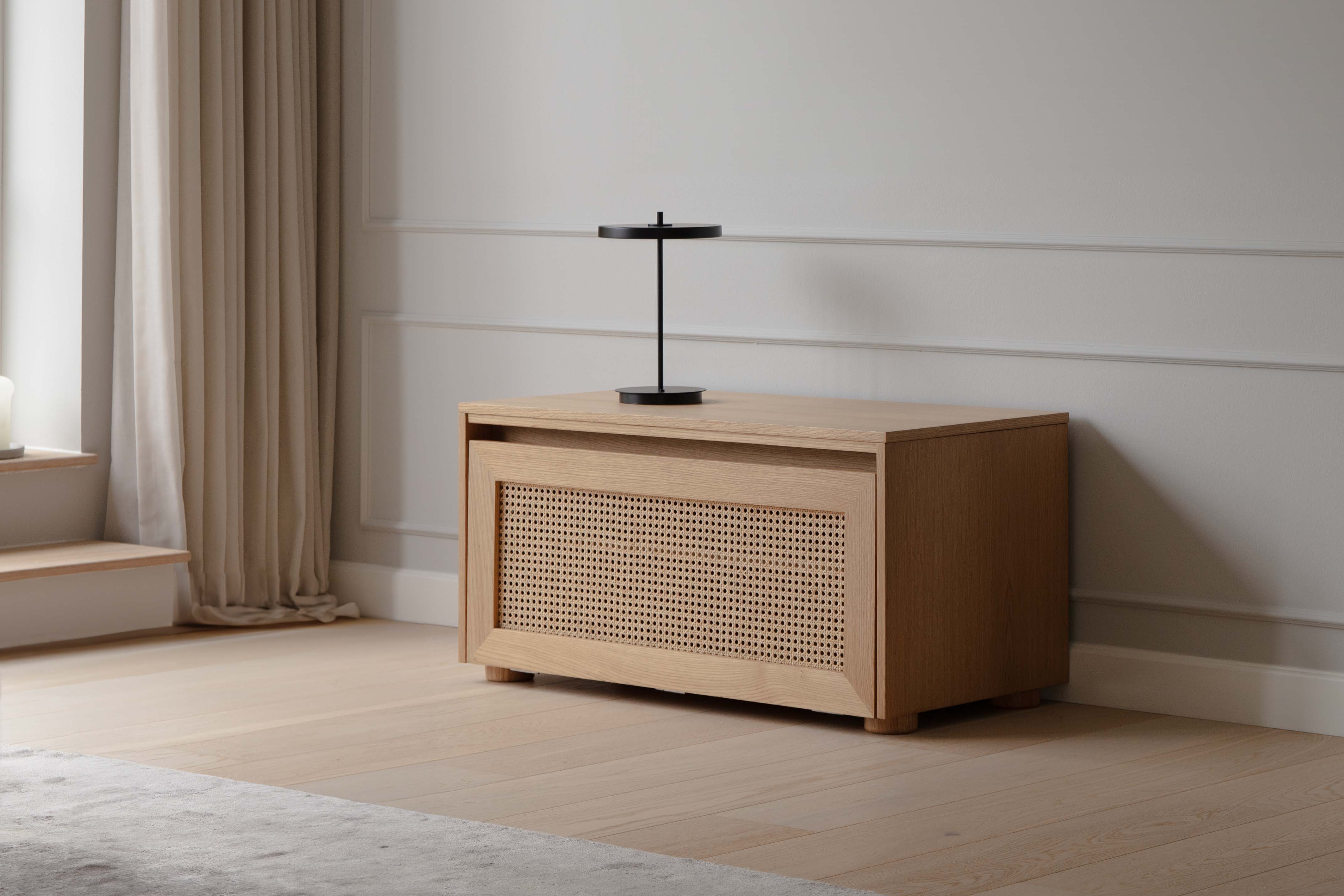 Hideaway seamlessly blends functionality with timeless design, offering versatile storage options for various spaces. The Hideaway storage bench does not only provide practical storage but also transforms into a comfortable seat, a charming reading nook, or a stylish TV bench. Available in venetian cane, oak veneer, and oak grid finishes, Hideaway can be tailored to your needs with optional add-ons like cushions, shelves, or boxes, ensuring it perfectly matches your style.