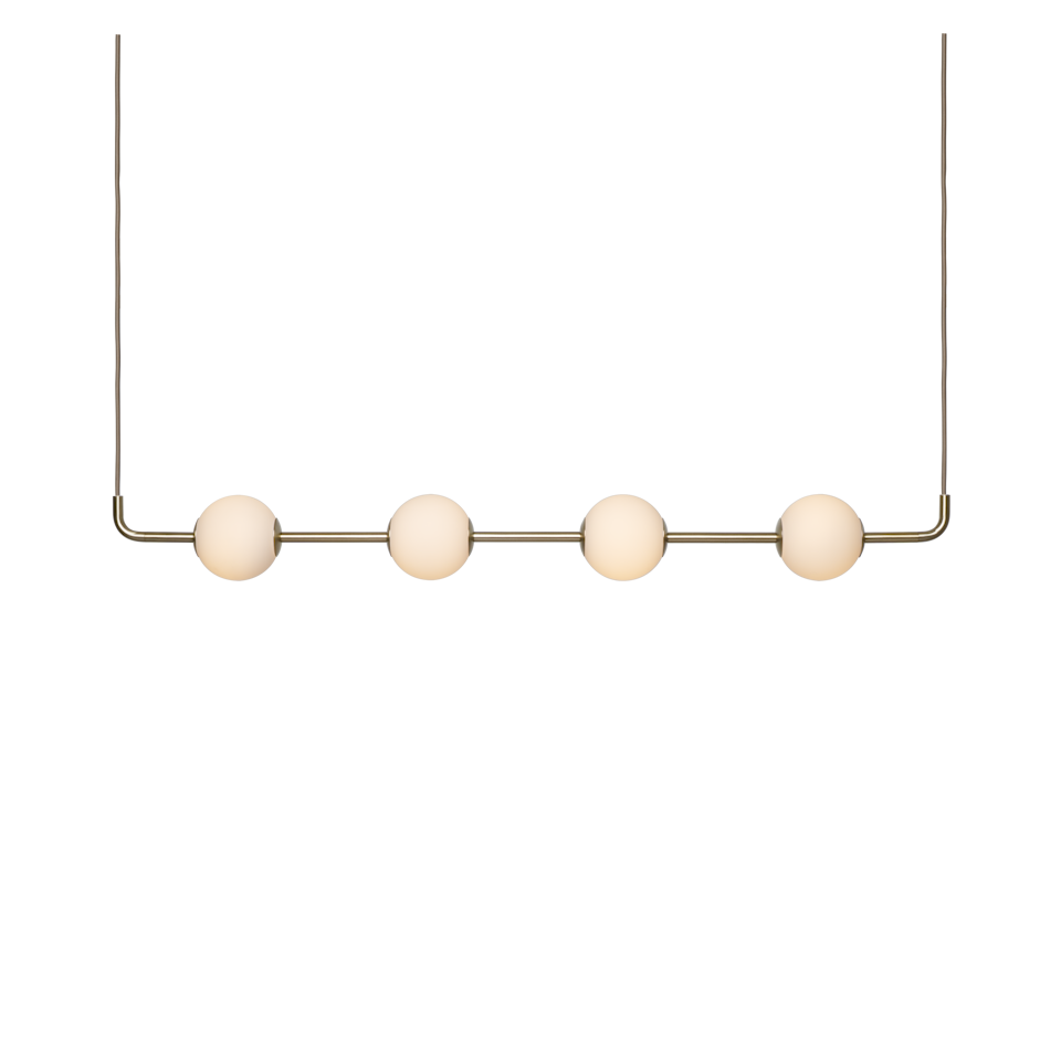 Audrey Linear extends the elegance of the Audrey collection in a new horizontal format. Four opal glass globes, suspended on slender brass stems, create a soft, balanced glow that enhances dining areas, kitchen islands, or workspaces. With its graceful silhouette and timeless blend of brass and mouthblown glass, Audrey Linear brings refined sophistication and warmth to any interior.